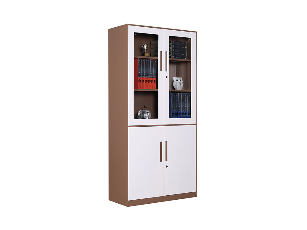 ● 一體結構設置,上部玻璃對開(kāi)門(mén),內置1層層板可調高度,內置物品可視,便于拿取,中間2個(gè)抽屜,下部對開(kāi)鐵門(mén)、門(mén)內一格板,設置有拉手和鎖。