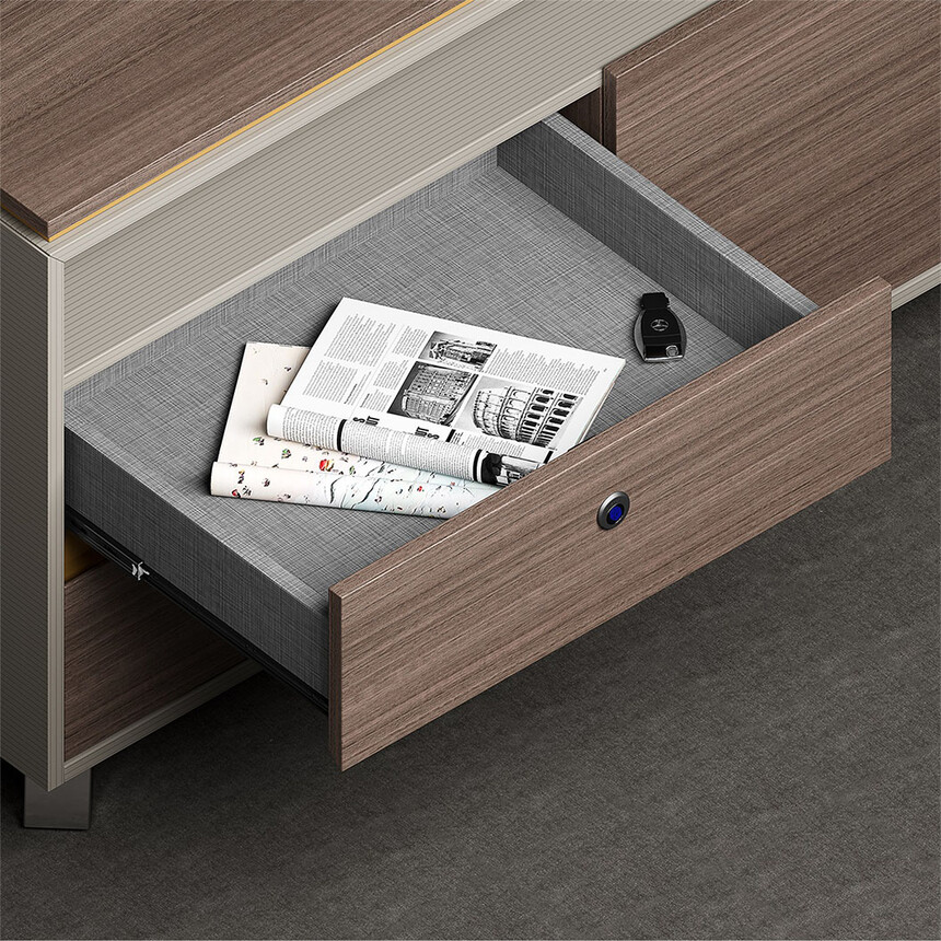 - 爵士胡桃+條紋蘆灰 (蘆灰色皮板,抽屜帶指紋鎖,分左右)