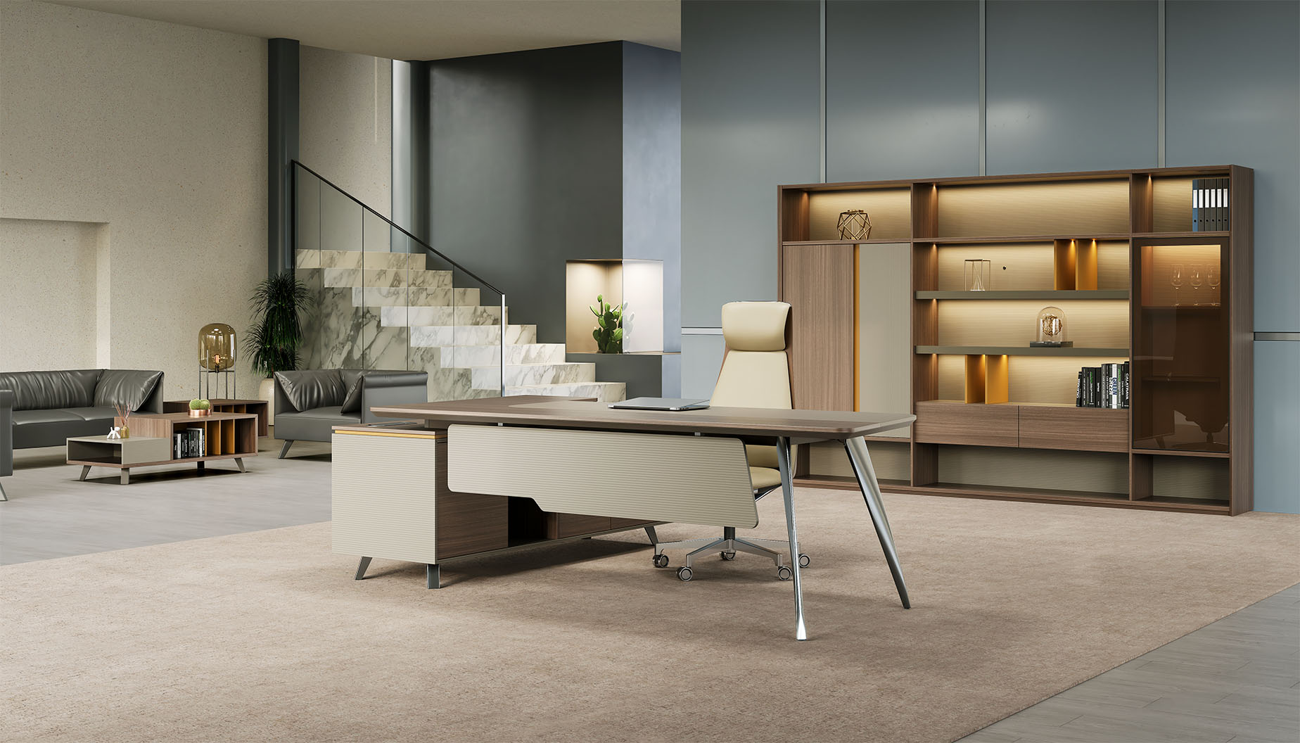賓利系列產(chǎn)品外觀(guān)采用意式輕奢的設計風(fēng)格,主附臺面一體化,雙層面板,整體造型全方位的意式切割風(fēng)格,體現了產(chǎn)品造型的不對稱(chēng)美,主附配置大小八字鋼腳讓整個(gè)產(chǎn)品既有質(zhì)感又有美感,加上產(chǎn)品搭配爵士胡桃與條紋蘆灰的配色,充分體現產(chǎn)品高品位的氣質(zhì),是現代都市辦公空間最佳選擇之一。