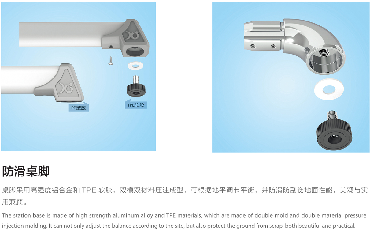 5.桌腳掌:1.5mm壁厚,腳套底有4個(gè)平衡調節機構。